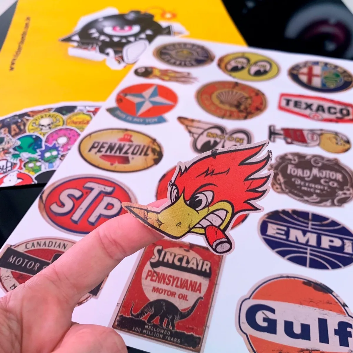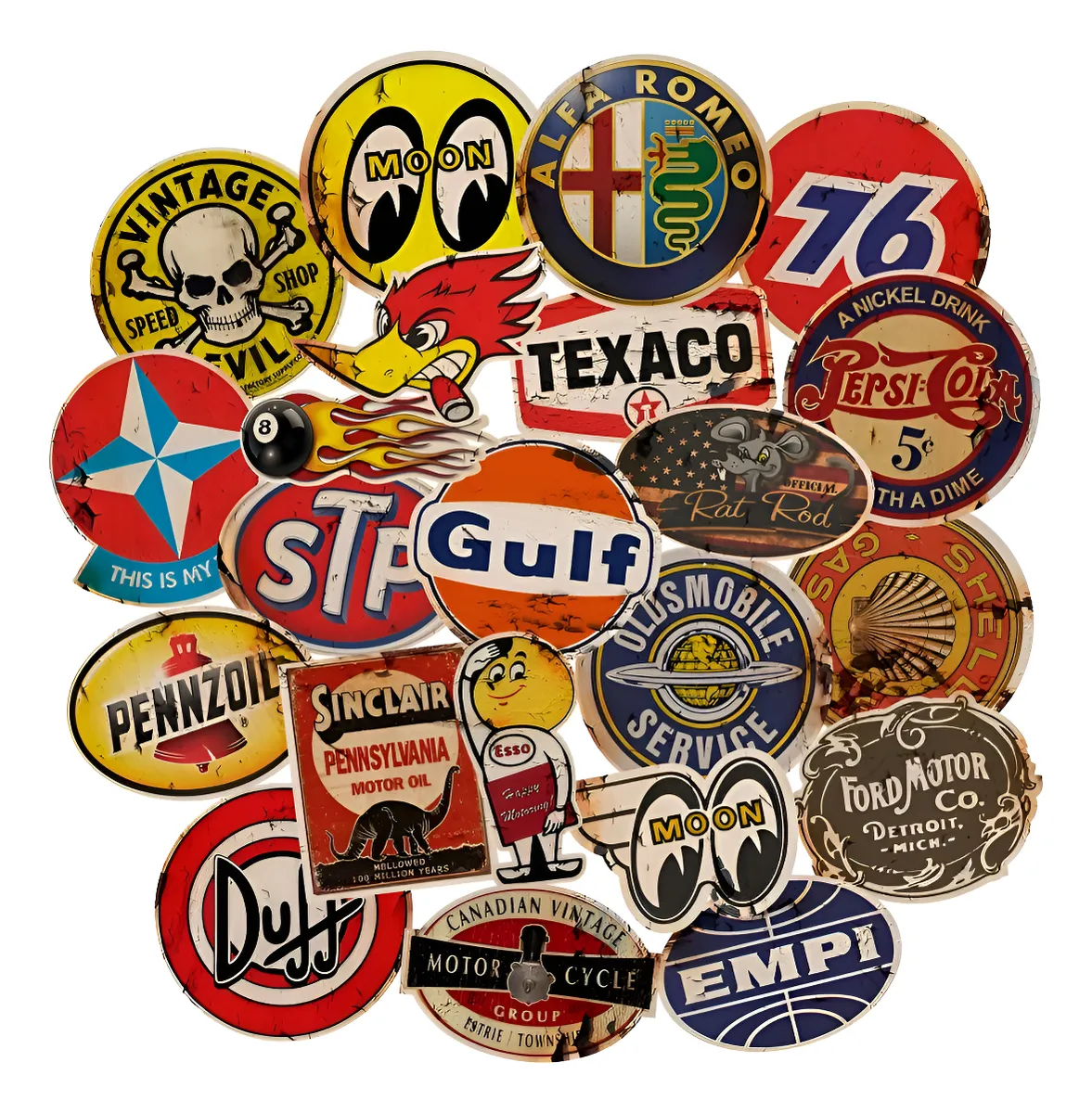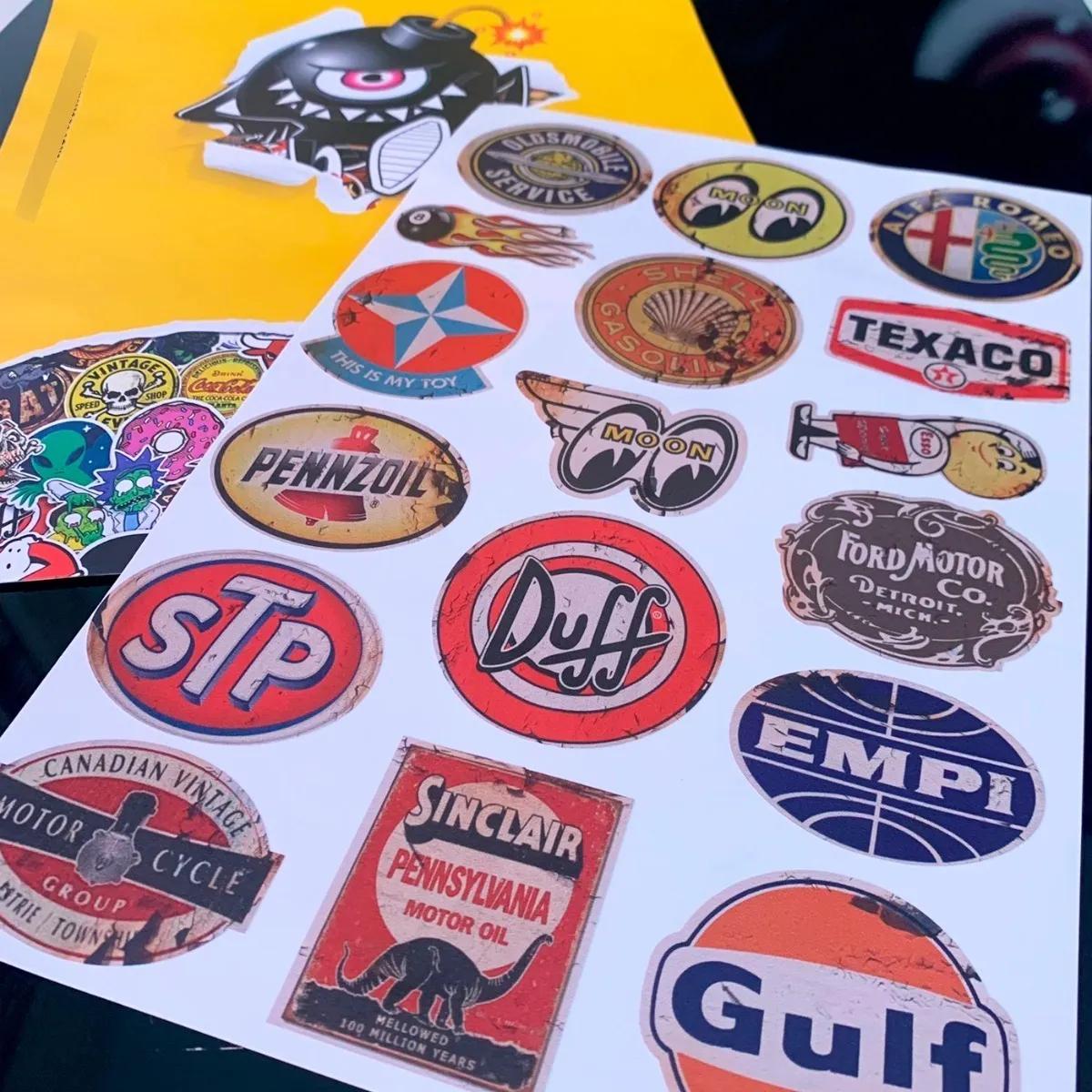 Cartela de adesivos retrô vintage, impermeáveis e de alta qualidade. Ideais para personalizar motos, carros, notebooks, garrafas e muito mais, com estilo clássico e durabilidade garantida.