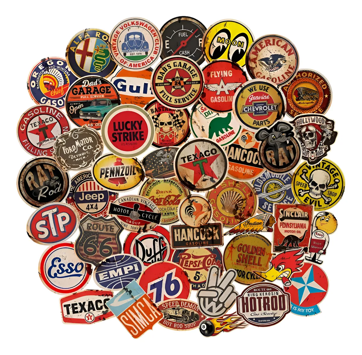 Cartela de adesivos retrô vintage, impermeáveis e de alta qualidade. Ideais para personalizar motos, carros, notebooks, garrafas e muito mais, com estilo clássico e durabilidade garantida.