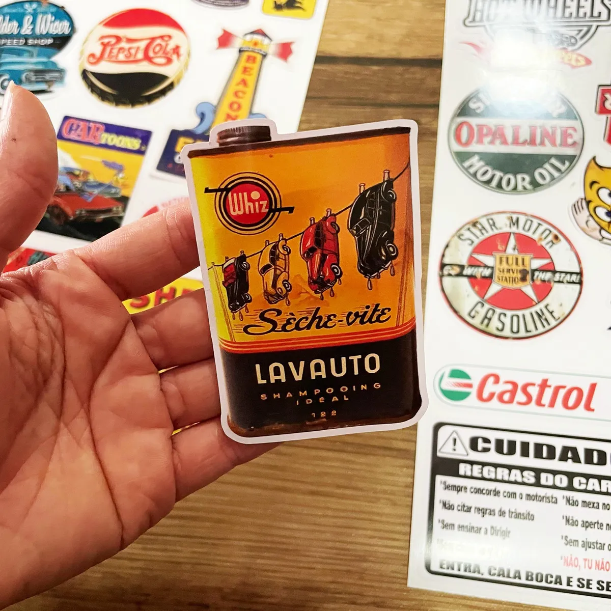 Cartela de adesivos retrô vintage, impermeáveis e de alta qualidade. Ideais para personalizar motos, carros, notebooks, garrafas e muito mais, com estilo clássico e durabilidade garantida.